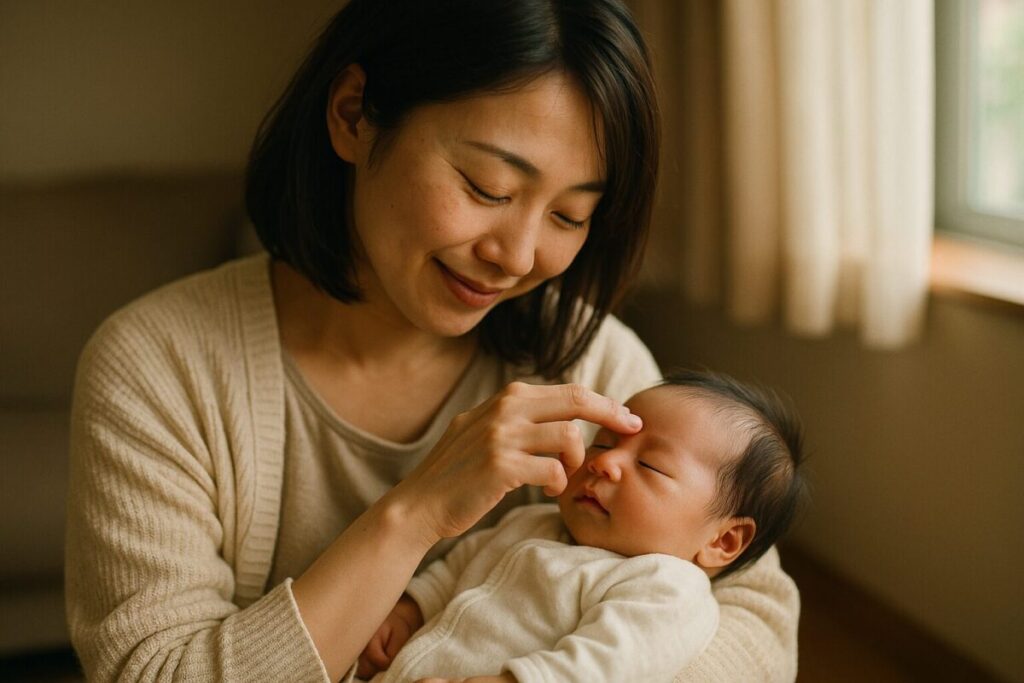 正常な前頭部の膨らみには、共通した特徴があります。左右対称にふっくらと丸みを帯びている、触れるとやわらかく弾力がある、頭頂部の大泉門(やわらかいひし形の部分)が普段は平らかやや凹んでいる状態である、これらが確認できれば、まずは安心していただいて構いません。