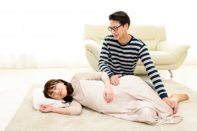 背中のマッサージをしてもらう場合は、横向きに寝た姿勢か、座った姿勢で行います。うつ伏せの姿勢は妊娠中期以降はお腹に負担がかかるため避けましょう。肩甲骨の周りや腰の両側を優しくさすってもらうだけでも、かなり楽になります。