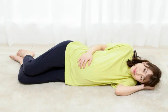 お腹が目立ち始めるこの時期から、徐々に横向きの姿勢に慣れていくといいでしょう。まだ仰向けでも大丈夫なことが多いですが、苦しさを感じ始めたら横向きに切り替えるタイミングです。この時期からシムス位を練習しておくと、後期になっても楽に眠れます。