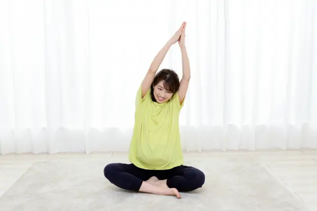 あぐらの姿勢で座り、両足の裏を合わせて体の近くに引き寄せます。背筋を伸ばしたまま、膝を上下にゆっくり動かして股関節を柔らかくしましょう。これは「バタフライストレッチ」と呼ばれ、股関節の柔軟性を高めて出産準備にも役立ちます。